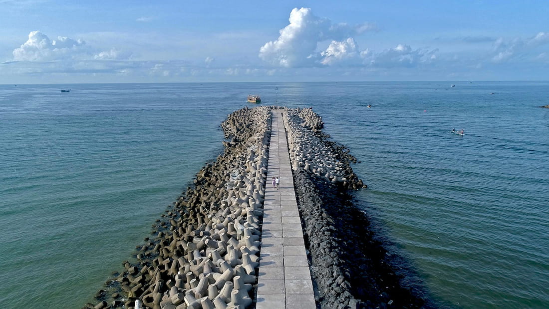 Ngoài ra, ngay tại cảng cá Bình Châu du khách chỉ cần di chuyển khoảng 5 phút bằng thuyền để di chuyển sang kè chắn sóng đối diện ngay cảng cá Bình Châu. Bãi biển nằm khuất sau những hàng cây xanh, kè chắn sóng với con đường thẳng tắp, là địa điểm để du khách có thể chụp ảnh check in, hứng gió biển hay chiêm ngưỡng khung cảnh tàu thuyền ra vào bến là lưu lại những bức ảnh riêng biệt.