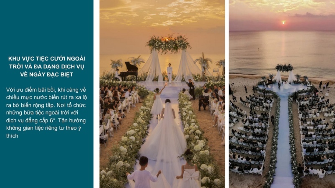 Với ưu điểm bãi bồi, càng về chiều nước biển sẽ được rút ra phía xa và lộ ra bờ biển rộng biến khu này trở thành khu vực tổ chức những buổi tiệc ngoài trời thơ mộng. Nơi đây sẽ là địa điểm thích hợp để du khách lưu lại những khoảnh khắc tuyệt vời và trọng đại của cuộc đời.