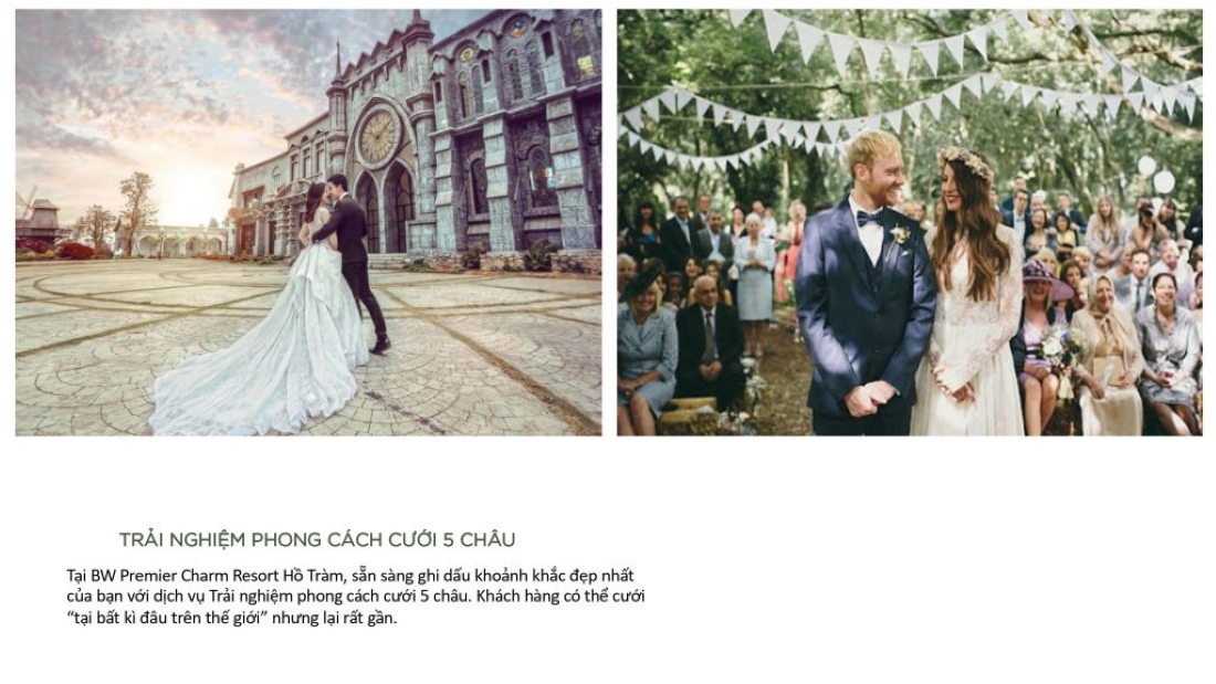 Thêm vào đó tại Best Western Premier Charm Resort Hồ Tràm, sẵn sàng ghi lại những dấu ấn đẹp nhất của du khách với dịch vụ tổ chức tiệc cưới phong cách 5 châu. Khách hàng có thể cưới ở bất kỳ nơi đâu trên thế giới mà không cần phải lo lắng về quá trình di chuyển.