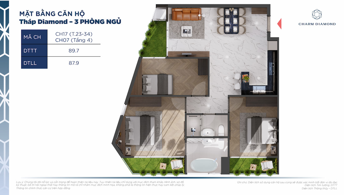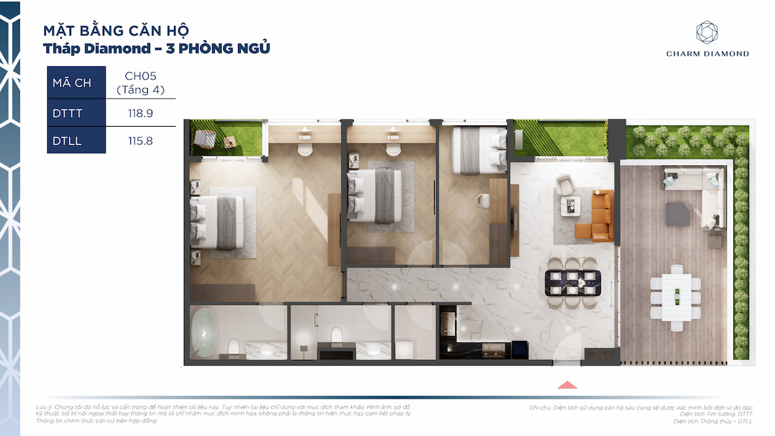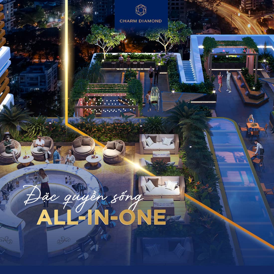 - Đặc quyền Charm Care: Cư dân Charm Diamond được tận hưởng độc quyền 10 năm cùng dịch vụ chăm sóc toàn diện của Charm Group. Với gói ưu đãi 600 triệu, cư dân được sử dụng miễn phí Charm Spa, Charm Fitness, Charm Group. phòng họp VIP…
