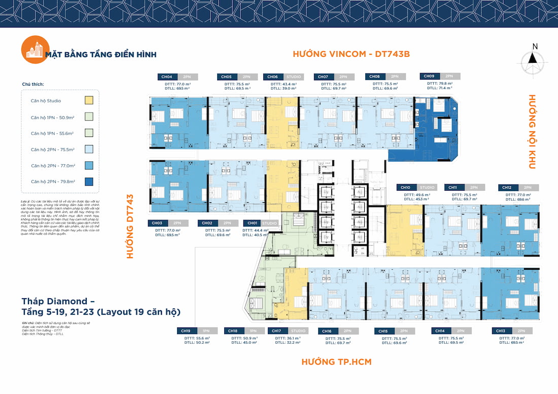 - Tầng 5-19 và tầng 21-23 mỗi sàn 19 căn