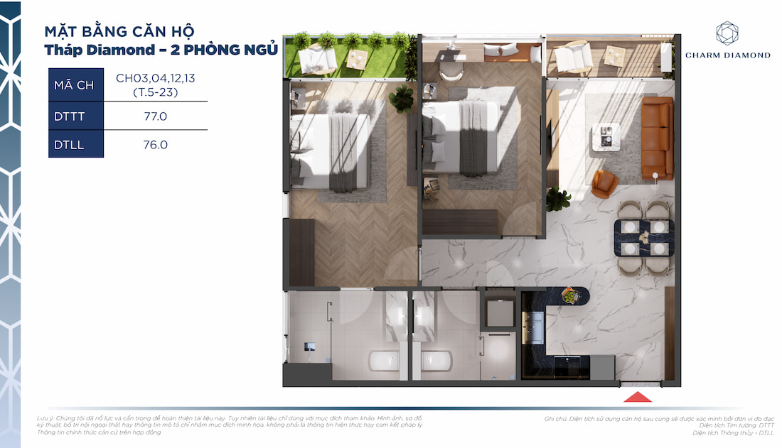 Căn hộ 2 phòng ngủ: Diện tích 75.5m2 – 76.3m2 – 79.6m2 thiết kế gồm 2 phòng ngủ, 2 WC, 1 phòng khách, 1 bếp, 1 sân phơi, 1 ban công
