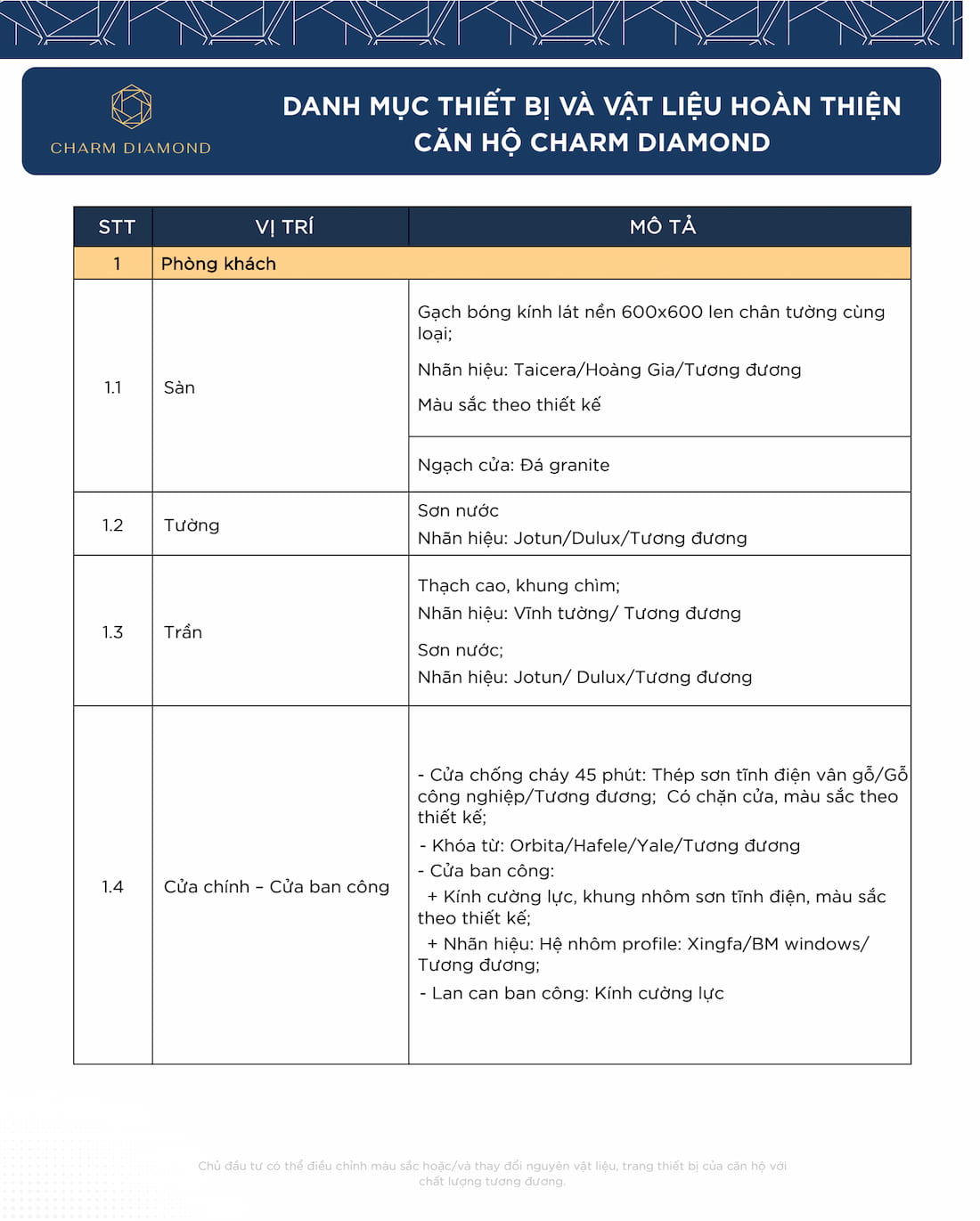 DANH MỤC BÀN GIAO DỰ ÁN CHARM DIAMOND DĨ AN