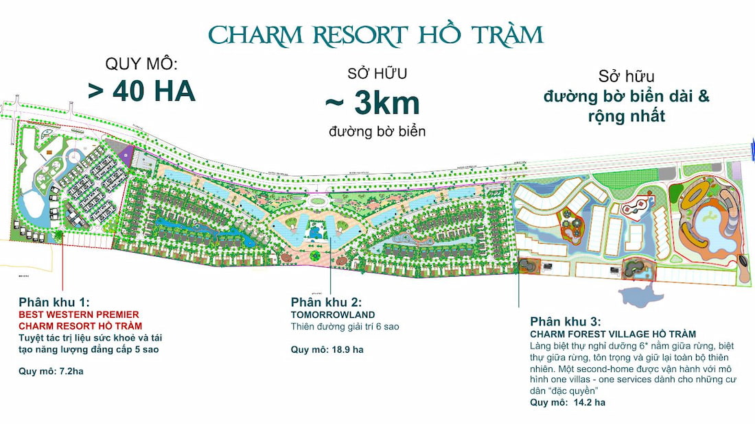 - Quy hoạch bài bản để tạo kiệt tác bên biển: Charm Group đã quy hoạch và phát triển dự án cực kỳ tỉ mỉ để tạo nên bức tranh nghỉ dưỡng bền vững. Đến với Charm Resort Hồ Tràm cư dân được tái tạo năng lượng mới, sức sống mới để cân bằng cuộc sống hiện đại. Thân và tâm hoà quyện cùng thiên nhiên, mây trời, nơi gác lại bộn bề cuộc sống, nơi Bạn được tận hưởng, trải nghiệm và thăng hoa.