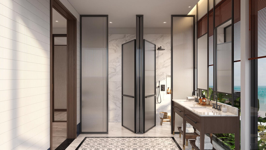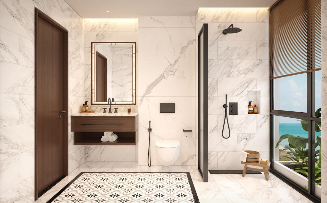 - Vật liệu điểm nhấn là đá tự nhiên sang trọng, thiết bị vệ sinh cao cấp, vật liệu mang âm hưởng truyền thống như gạch bông, gạch men gốm.