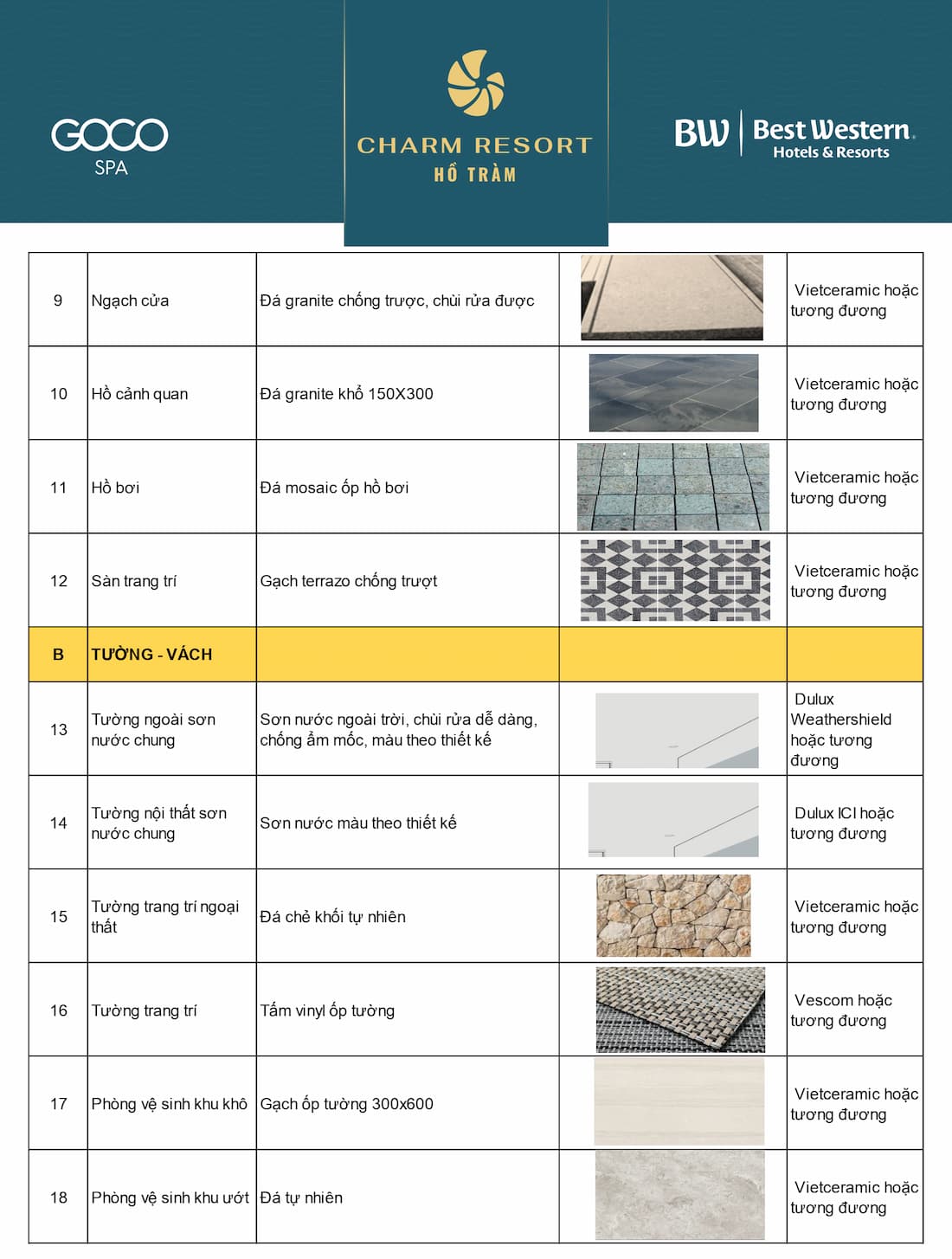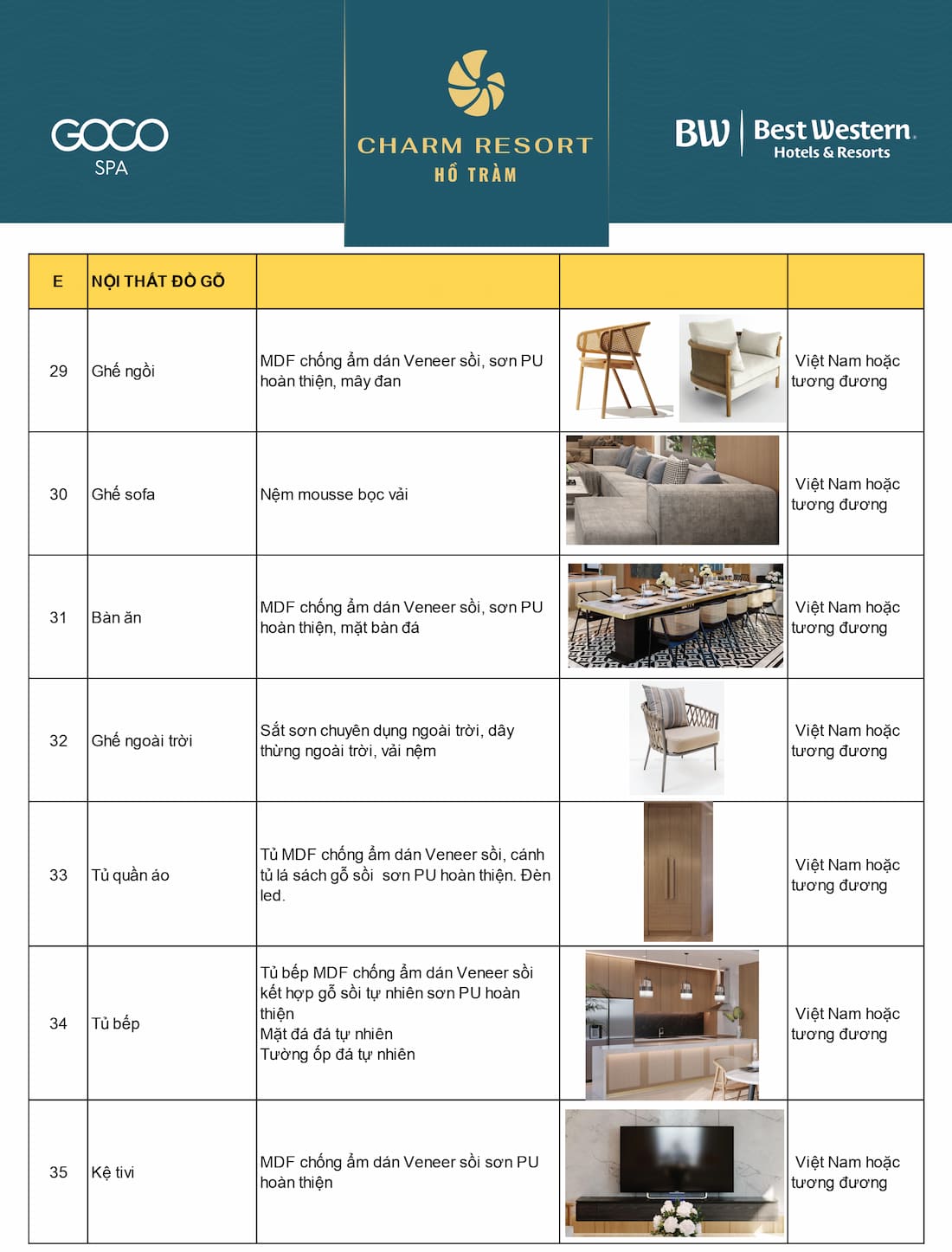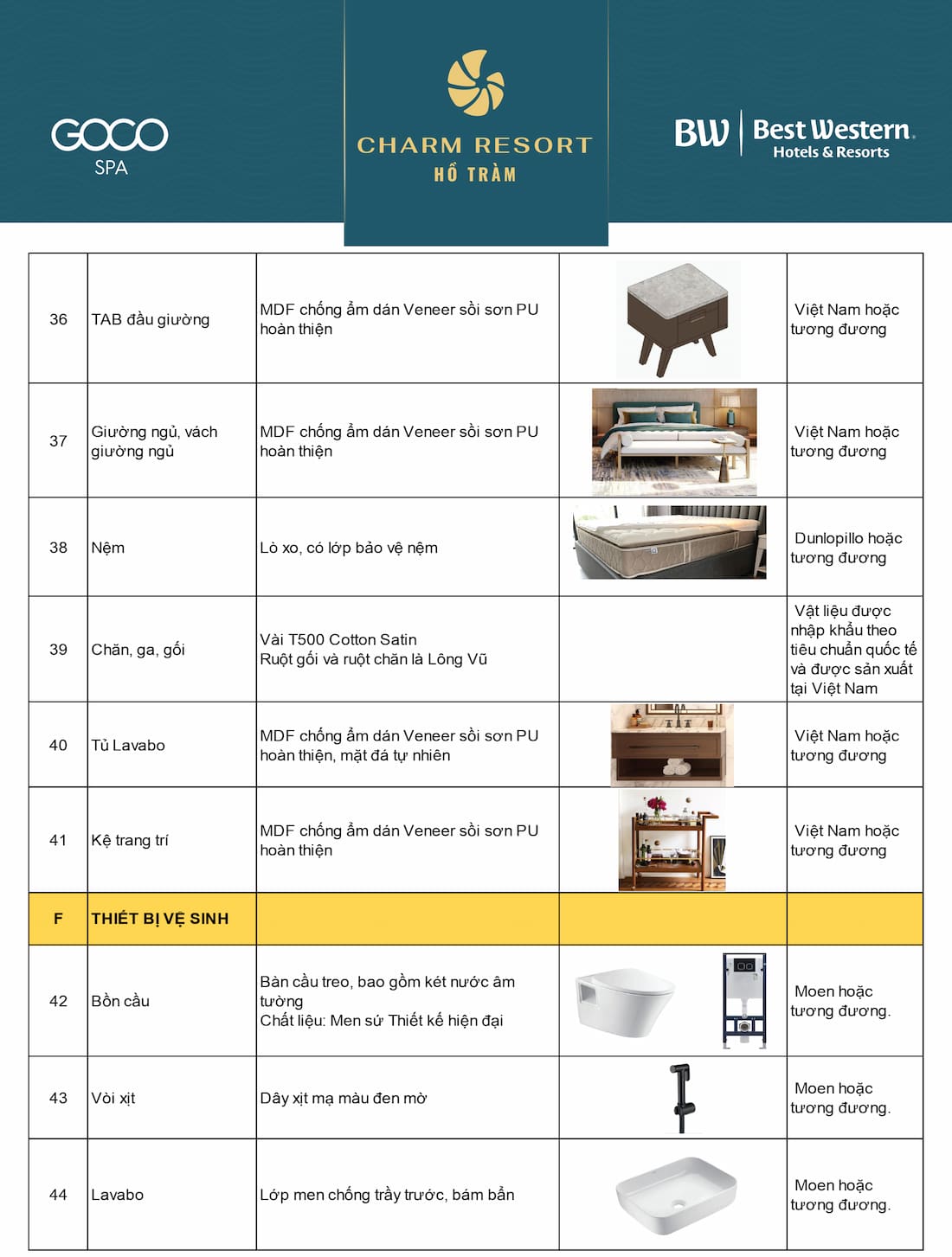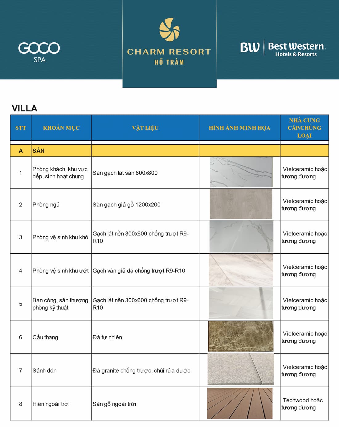 DANH MỤC BÀN GIAO DỰ ÁN CHARM RESORT HỒ TRÀM