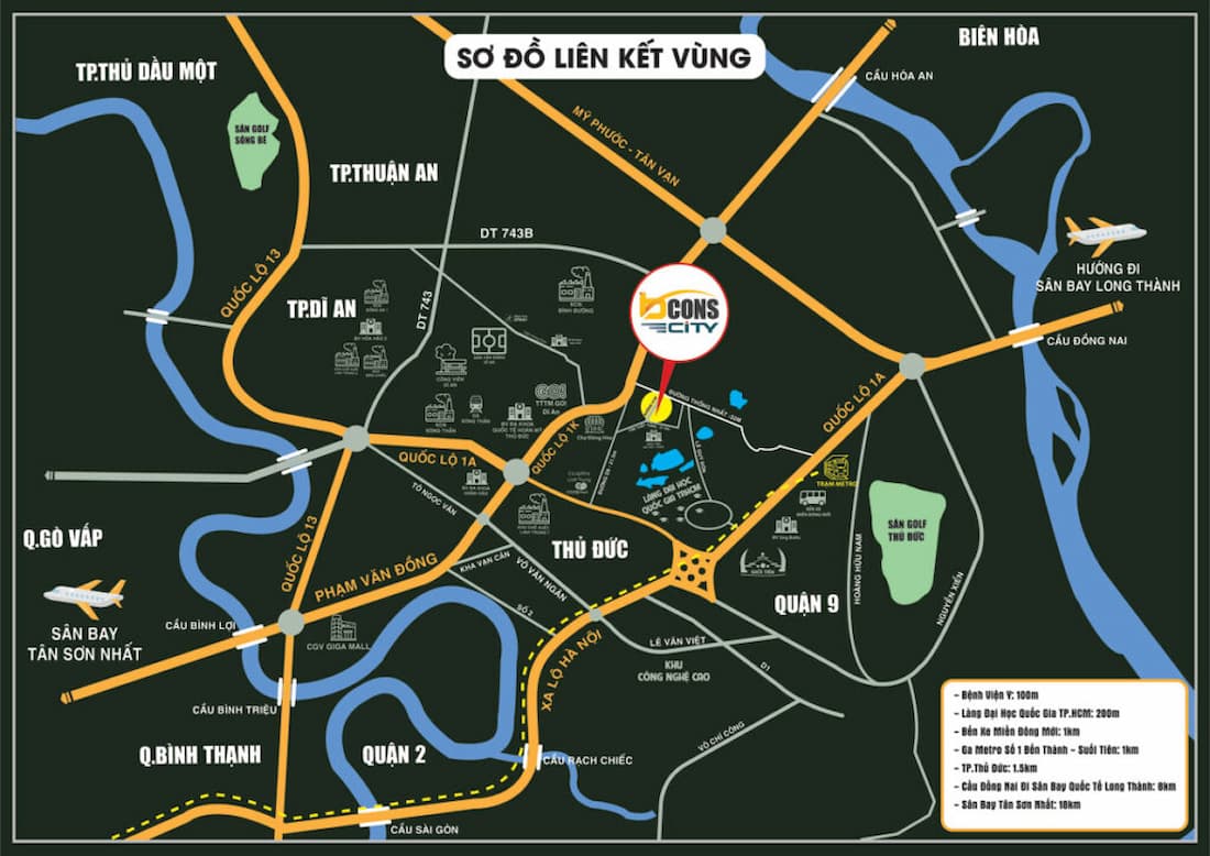 Chỉ mất khoảng 20 phút để đến trung tâm Sài Gòn, cư dân cũng có thể nhanh chóng di chuyển đến Thủ Dầu Một hay Thuận An nhờ hệ thống đường xá rộng mở. Ngoài ra, khu vực xung quanh dự án cũng tập trung nhiều tiện ích quan trọng, đáp ứng nhu cầu sống hàng ngày: