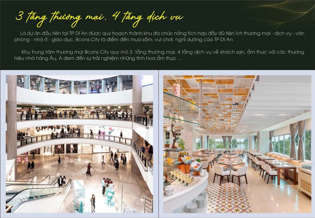 Bcons City là dự án tiên phong được quy hoạch theo mô hình đa chức năng, tích hợp đầy đủ tiện ích từ dịch vụ, thương mại, văn phòng đến khu nhà ở hiện đại. Nhờ đó, nơi đây hứa hẹn trở thành một điểm đến sôi động, nhộn nhịp bậc nhất tại thành phố Dĩ An.