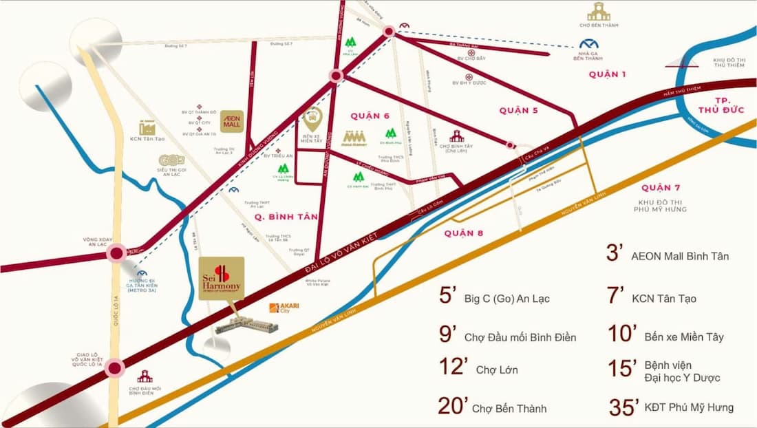Sei Harmony tọa lạc tại đường Lê Tấn Bê, phường An Lạc, quận Bình Tân, với vị trí chiến lược giúp cư dân dễ dàng di chuyển đến các khu vực trung tâm thành phố. Chỉ cách đại lộ Võ Văn Kiệt vài phút, dự án sở hữu khả năng kết nối nhanh chóng đến Quận 1, Quận 5, Quận 6, Tân Phú và khu đô thị Phú Mỹ Hưng thông qua các tuyến đường huyết mạch.