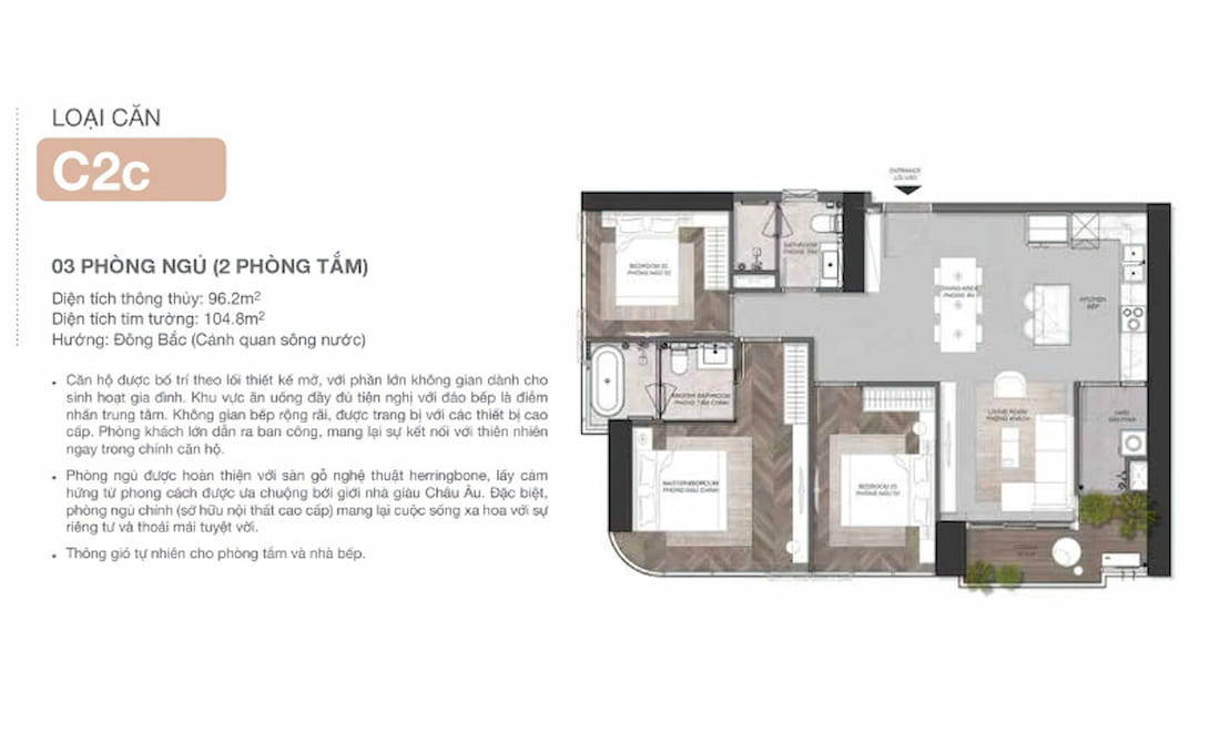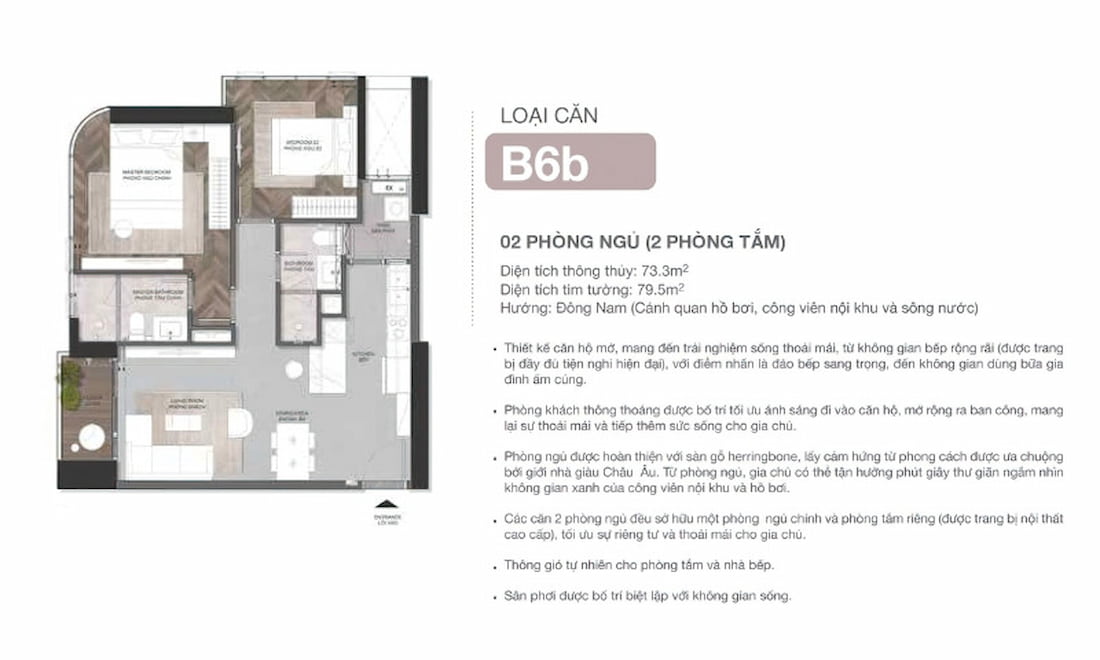 - Căn hộ 2 phòng ngủ có không gian rộng rãi từ bếp đến phòng ăn và được trang bị đầy đủ các trang thiết bị cần thiết. Phòng khách rộng rãi và thoáng mát, được bố trí để cho ánh sáng tự nhiên lọt vào ban công, tạo không gian sống thoải mái và giúp gia chủ tận hưởng được không khí tự nhiên mà căn hộ. được trang trí bằng sàn gỗ herringbone, tạo không gian sang trọng và lấy cảm hứng từ kiến trúc châu Âu, giúp cư dân có thể tận hưởng mọi khía cạnh của thành phố ngay từ bên trong phòng ngủ. Khu vực phơi quần áo được thiết kế riêng biệt đặt bên ngoài, tối ưu hóa không gian sống bên trong và không gian thoải mái.