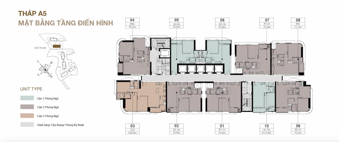 - Tháp A5: Gồm 37 tầng, 351 căn hộ (9 căn/tầng).