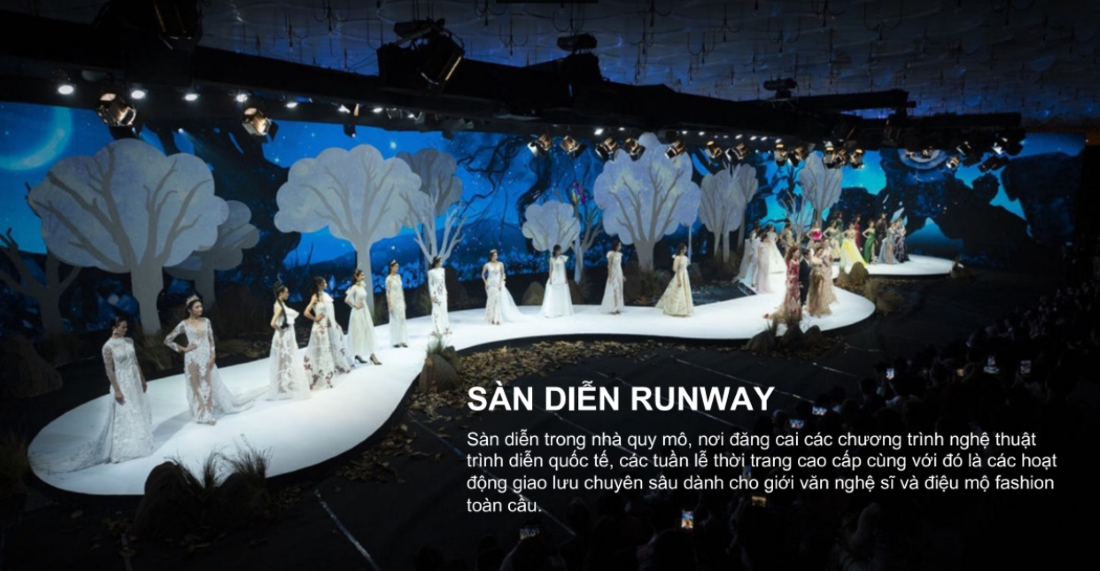 Sàn diễn Runway trong nhà được triển khai quy mô, đây là nơi đăng cai các chương trình nghệ thuật trình diễn quốc tế, các tuần lễ thời trang cao cấp cùng với đó là các hoạt động giao lưu chuyên sâu dành cho giới văn nghệ sĩ và đam mê fashion trên toàn cầu.