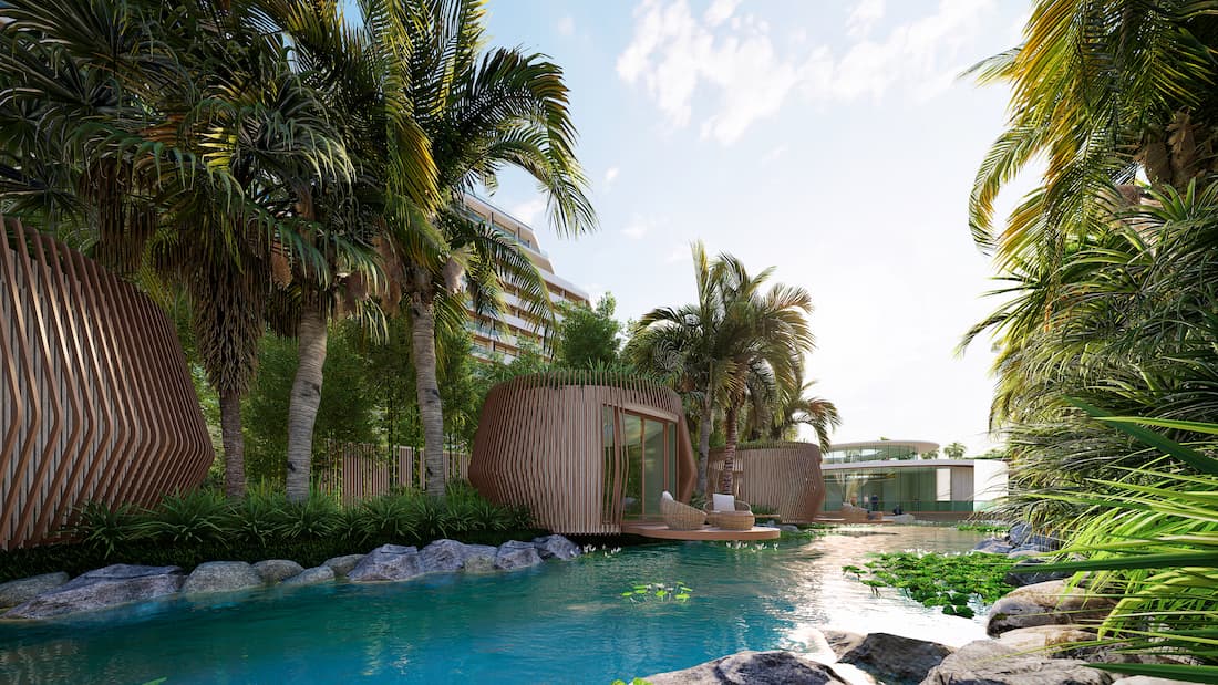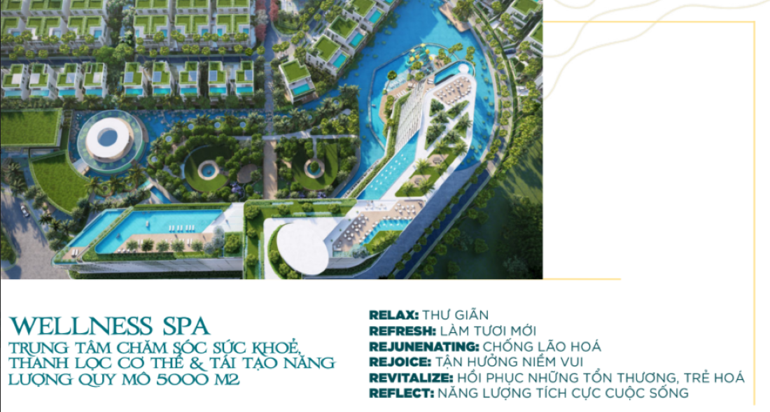 Wellness & Spa quy mô lên đến 5.000m2 với kiến trúc sinh thái và thân thiện với tự nhiên, phong cách kiến trúc phỏng sinh học (Biomimetic Design). Ngoài ra chủ đầu tư còn sử dụng những vật liệu mây tre gần gũi với thiên nhiên và các tòa nhà được làm hòa cùng tổng thể xanh. Vào ban đêm, mỗi công trình như một chiếc lồng đèn phát sáng, hòa vào nhịp điệu ánh sáng của toàn bộ tổng thể dự án.